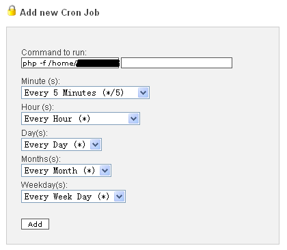 第三步,进入Cron Jobs,并按下图设置即可,方框内要填上“/public_html/tw2other/cron.php”,即cron.php的绝对路径。